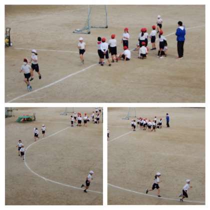 3年は、体育科で持久走をしていました。赤組と白組に分かれて、半数ずつ走ります。記録係の組は、「がんばれー」と応援していました。走っている人の力になりました。