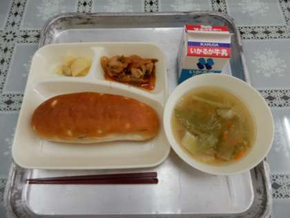 今日の給食の献立は、「おさつパン、牛乳、鶏肉のバーベキューソテー、ウィンナーとキャベツのスープ、焼きじゃが」でした。