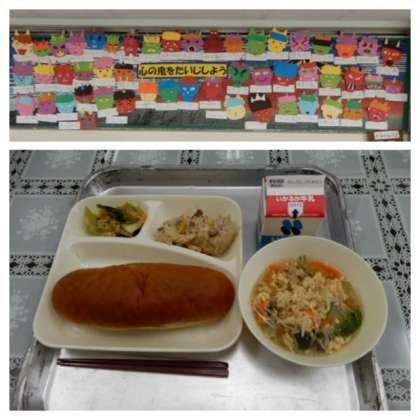 玄関掲示は、3・4年生の作品です。明日は節分ですので、鬼退治をして福をたくさん呼び込みたいです。