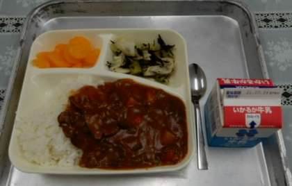 今日の給食の献立は、「ごはん、牛乳、ハヤシライス、キャベツのひじきドレッシング、みかん(缶)」でした。