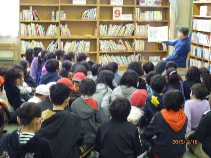 今日の20分休みに,「お話しBOX」のみなさんにおいでいただき、絵本の読み聞かせをしていただきました。読み聞かせの最後に、2月生まれの児童がロウソクの火を吹き消しました。みんなの願い事が叶いますように。