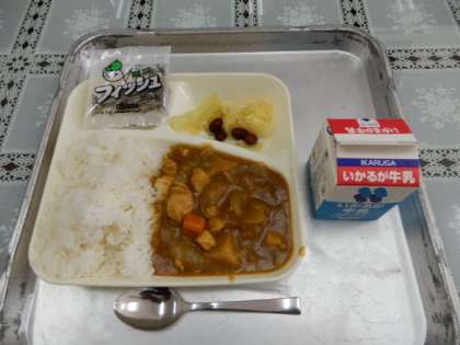 今日の給食の献立は、「ごはん、牛乳、チキンカレーライス、ビーンズサラダ、ミニフィッシュ」でした。