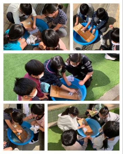3年は、社会科の学習で洗濯板を使って昔の洗濯を体験しました。洗濯の大変さを実感しました。