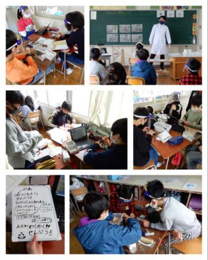 6年は、理科の「発電と電気の利用」の学習として、人感センサーや温度センサーを利用したオリジナル家電をプログラミングして動かしました。
