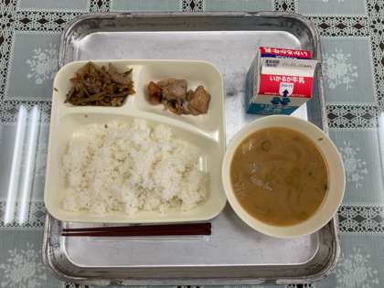 今日の給食の献立は、「ごはん、牛乳、鶏肉の照り焼き、さつまいものみそ汁、きんぴらごぼう」でした。