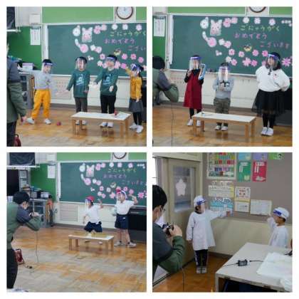1年は、入学式で披露するお迎えの演技で、グループに分かれて学校生活の様子を紹介するビデオ撮影をしました。