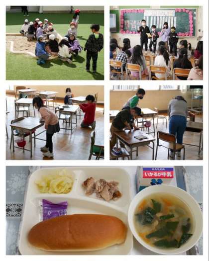 今日は、今年度最後の給食になります。献立は、「コッペパン、牛乳、豚肉のガーリック焼き、スープ、サワーソテー、ブルーベリージャム」でした。
