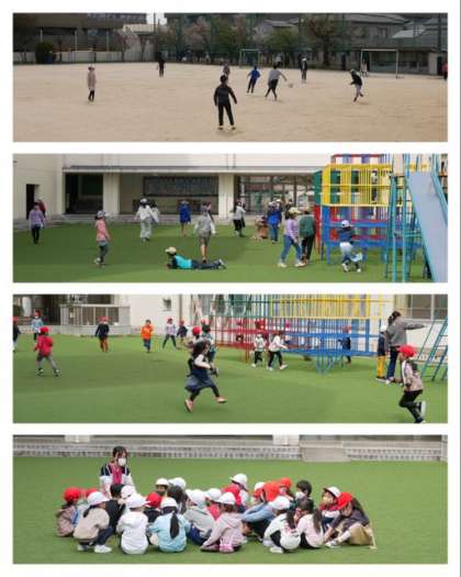休憩時間には、久しぶりに子どもたちの元気に遊ぶ姿が戻ってきました。早速1年生も人工芝の中庭で楽しく遊びました。