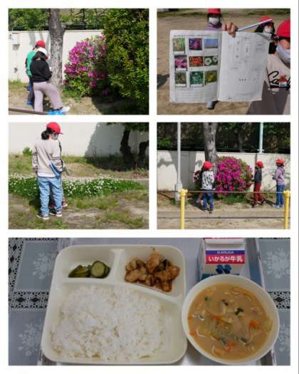 2年は、理科の春をみつけようで、先生から渡された草花や樹木の写真を実際に校庭のどこに植わっているか探しました。
