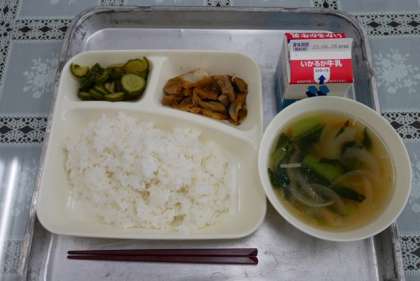 今日の給食の献立は、「ごはん、牛乳、ホイコウロー、中華スープ、きゅうりのピリ辛和え」でした。