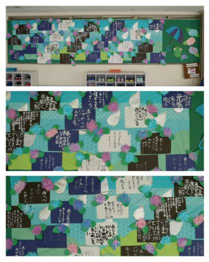 6月になりましたので玄関掲示が変わりました。6月は、5年生の作品です。花紙で作ったアジサイを飾り付けた色画用紙に梅雨をテーマにして作った詩を書いています。