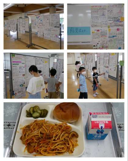 6年生は、総合的な学習の時間に各自で調べた防災についてのポスターをランチルームに掲示しました。いろいろな学年の人が給食を返却するときに立ち止まって読んでいました。今日の給食の献立は、「黒糖パン(1/2)、牛乳、スパゲッティミートソース、きゅうりのピクルス」でした。