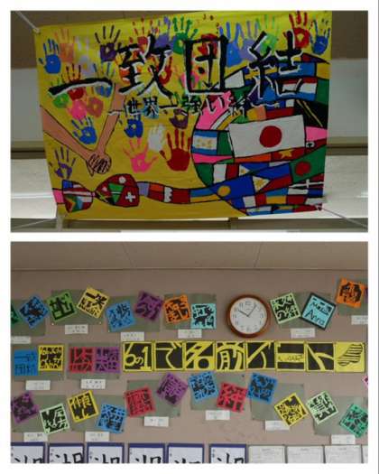 6年の教室には、クラス全員の手形を付けた学級旗が飾られています。また、教室の背面には名前と思い思いの言葉をデザインしてカッターで切り抜いて作った「名前アート」が掲示されています。