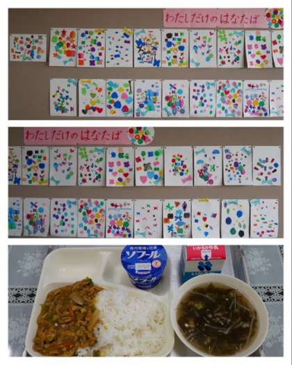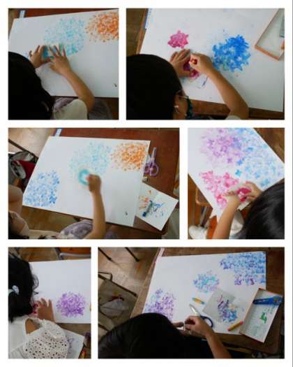 1年は、図画工作科でパスを使ってアジサイの花びら一枚一枚を指で塗り広げていきました。また、教室の背面には「わたしだけのはなたば」を題材にした作品を掲示しています。