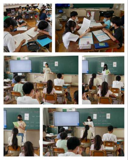 6年は、外国語の学習で、外国の人に「日本の行事を紹介しよう」というテーマで一人一人前に出てスピーチしました。ジェスチャーを交えて日本の四季の見どころを上手に英語で紹介していました。