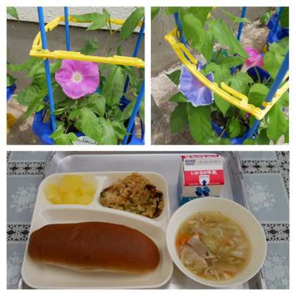 1年生が育てているアサガオに花が咲きました。これからツルを伸ばしながらたくさんの花を咲かせてくれるでしょう。