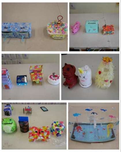カラフルに飾り付けをした貯金箱が並んでいます。