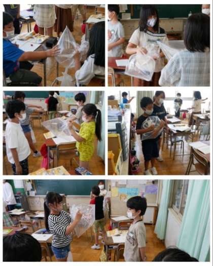 4年は、理科の学習で閉じ込められた空気の感触を実際にごみ袋に空気を閉じ込めて体感しました。