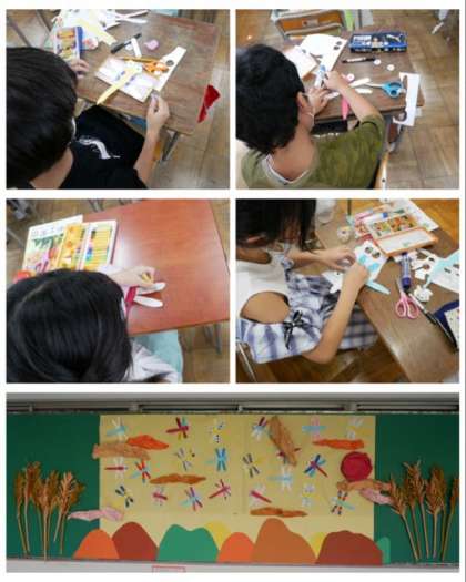 9月の玄関掲示は、3年生の作品です。すすきが咲く野山に子どもたちが作った色とりどりのトンボが楽しそうに飛んでいる風景です。