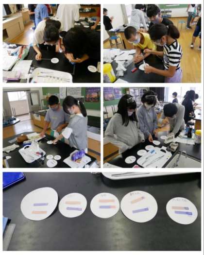 6年は、理科の水溶液の性質でリトマス紙を使って酸性・中性・アルカリ性に仲間分けができることを実験で確認しました。