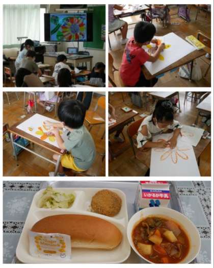 1年は、図画工作科でひまわりの絵に取り組んでいます。パスを使って花びらをしっかり塗り込んだり、塗り広げたりしていました。