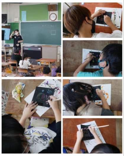 1年は、いろいろな色のパスで塗った上から黒のパスを塗り、割りばしペンで引っかいてお絵かきをしました。黒一色の画面からカラフルな色が出てきて大喜びでした。