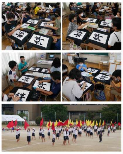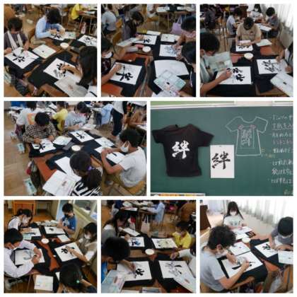 6年生と5年生は、運動会の団体演技をする時に着るTシャツの背中に「絆」の文字を白色で塗りこみました。その文字のとおり、この演技を通じて今まで以上に絆を深めてほしいです。
