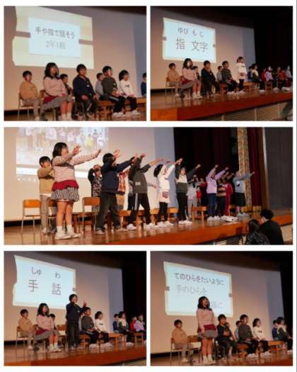 2年「手や指で話そう」では、手話や指文字の紹介と「手のひらを太陽に」を手話をしながら歌いました。