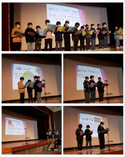 5年「みんなちがってみんないい」では、金子みすゞさんの詩の朗読から始まり、世の中の様々な人権について調べたことを発表しました。