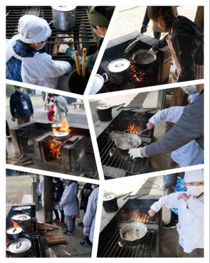 野菜を切ったり、薪でかまどに火を入れたり、グループで分担してできました。