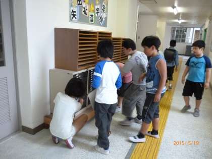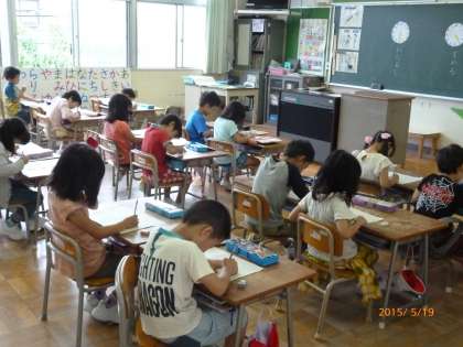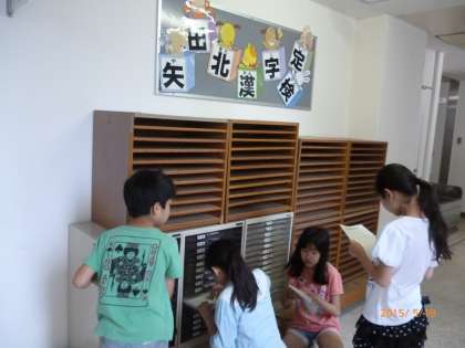 毎週火曜日の朝の時間は、「漢字タイム」です。1階廊下に置いている書棚から自分の進度に合わせたプリントを持っていきます。1年生は、ひらがなの練習をしています。