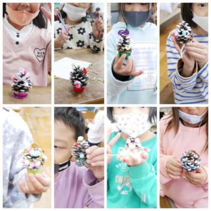 1年の教室は、クリスマスリースやクリスマスツリーを飾って、クリスマスムードに包まれています。そして、今日は図画工作科で松ぼっくりを使ったクリスマスツリー作りをしました。モールなどできれいに飾り付けをして完成です。