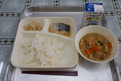 今日の給食の献立は、「ごはん、牛乳、さごしのおろし醤油かけ、ひと口がんもとさといもの味噌煮、もやしのゆずの香和え」でした。