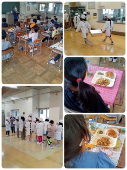今日の給食は、「やきそば」「きゅうりのしょうがづけ」「まめこんぶ」「パン」「牛乳」です。新学期の給食が始まりました。自分たちで準備、配膳をしておいしくいただきます。1年生もしっかり食べました。
