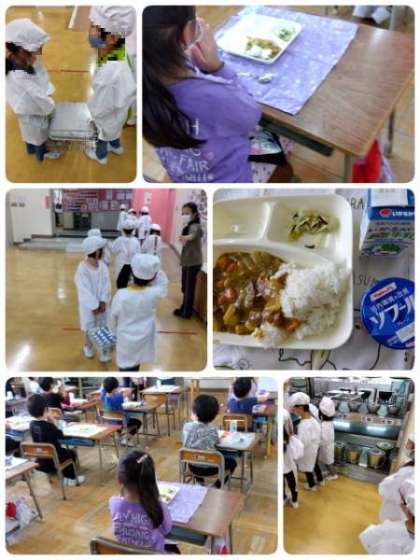 1年生が入学して、一か月がたちました。最初は、給食の準備も6年生に手伝ってもらっていましたが、今では自分たちでしっかりできています。