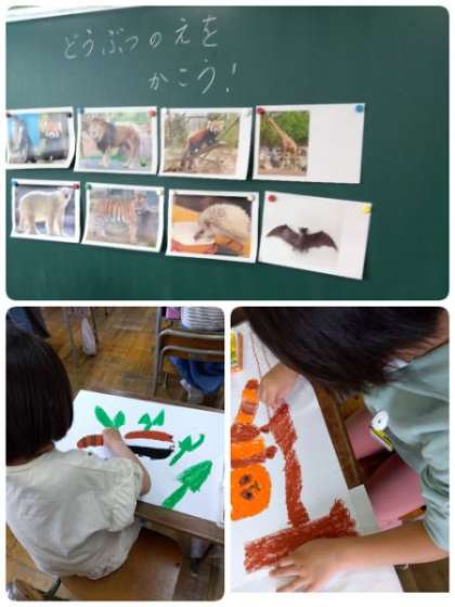 図画工作で「どうぶつのえ」を描きました。先日、遠足で行った天王寺動物園のことを思い出し、自分の好きな「どうぶつ」を描いています。パスを丁寧に使い、しっかりと色をつけています。