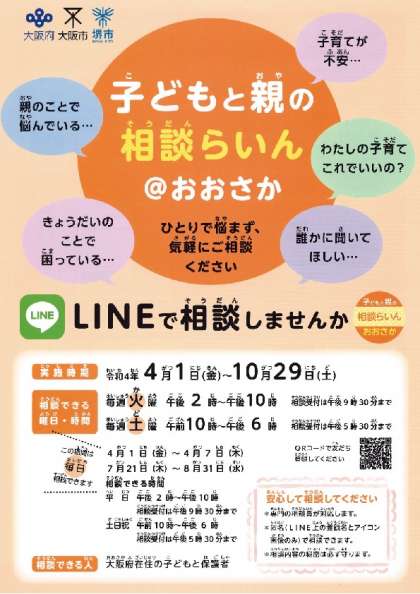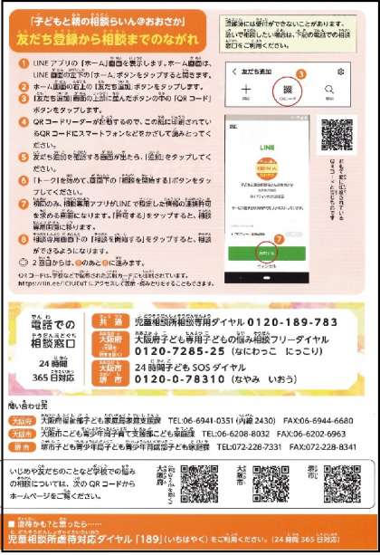 大阪府・大阪市から「子どもと親の相談らいん」の案内を配布しています。画面が見えにくい場合は、こちらをクリックしてください。