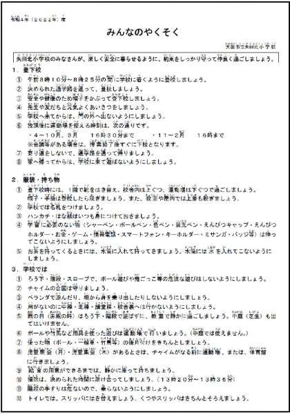 矢田北小学校のみなさんが、楽しく安全にくらせるように「みんなのやくそく」を決めています。ご家庭でもご確認ください。