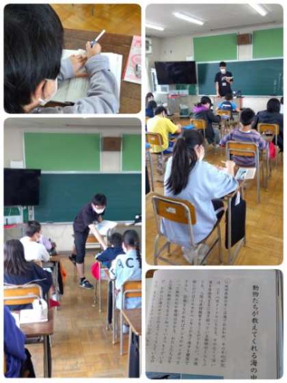 5年生の国語です。説明文「動物たちが教えてくれる海の中のくらし」の学習をしています。今日は、段落分けをしていました。「はじめ」「なか」「おわり」で、まとまりで読むようにしていきます。