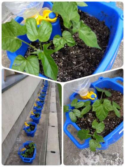 1年生が育てているアサガオが大きくなってきています。本葉が出てきました。これからもどんどん大きく生長します。水やりをしっかりと頑張ってくださいね。