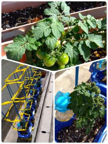ミニトマトも太陽の光を浴びて、大きく成長しています。実もまだ青いですが、大きくなってきています。