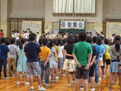 今日の児童集会では、土曜授業の朝の時間に行う音楽集会の練習をしました。