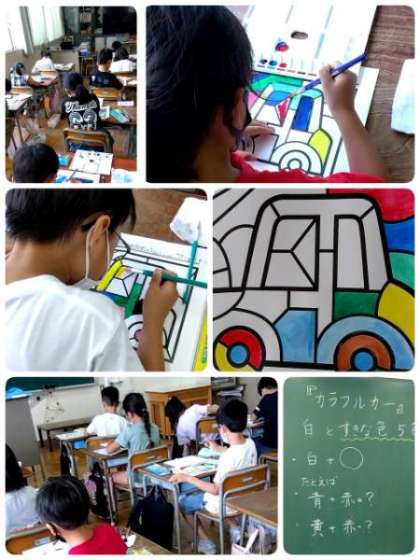 2年生が図画工作で絵の具を使っていました。題材は、「カラフルカー」です。好きな色を混ぜて、自分だけの色を作ります。水と混ぜて色をたくさん作っています。はじめての絵の具でしたが、丁寧にきれいに塗っています。