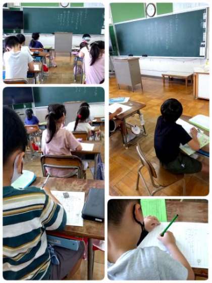 1年生が連絡帳を書いています。しっかりと黒板の文字を見て、ノートにていねいに書いています。一文字ずつ丁寧に濃い字で書く練習をしています。