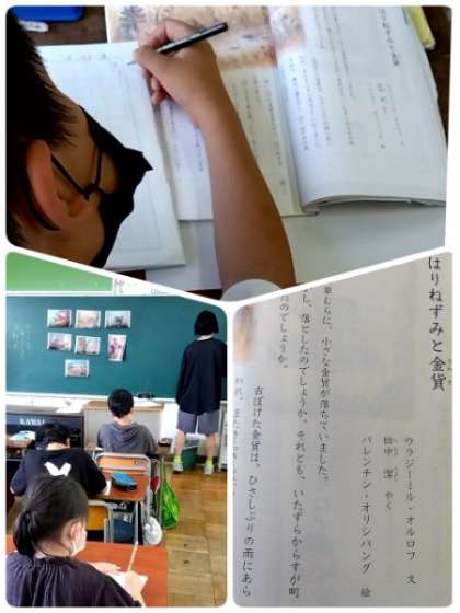 3年生の国語の授業です。「はりねずみと金貨」の物語を学習しています。今日は、初めて読んだ感想を書いていました。登場人物の気持ちをしっかりと読み取っていきましょう。