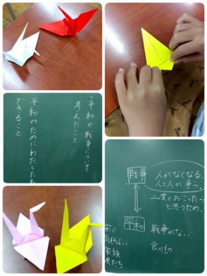 矢田北小学校では、平和学習に取り組んでいます。4年生が「戦争」と「平和」について考えました。そのあと、「私たちができること」について、意見を交換し、平和の象徴である「折り鶴」を折りました。