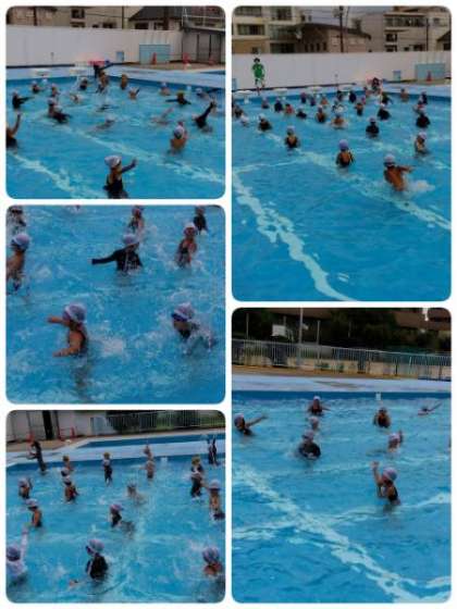 今年度のプール納めです。どの学年も水泳学習に一生懸命取り組みました。これは、低学年(1・2年生)のプールの様子です。「アヒルの体操」を楽しく行いました。顔を水につけることが苦手な1年生もこの1カ月で、もぐることができるようになりました。(7月15日 記事)