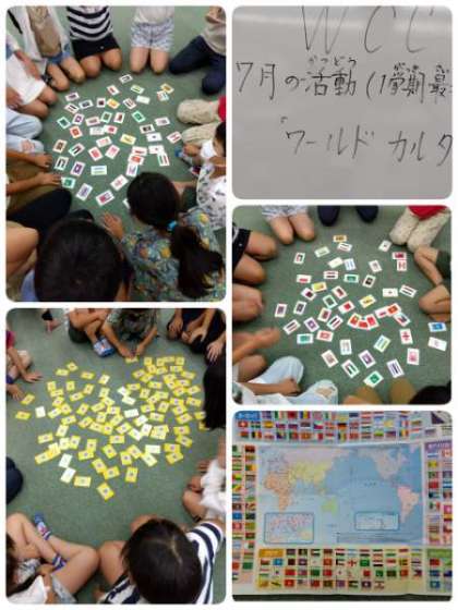 今日は、1学期の最終です。みんなで「ワールド・カルタ」をしました。世界のたくさんの国の名前をしっかりと覚えました。