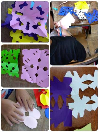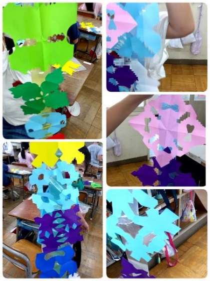 1年生が、折り紙できれいな「飾り」をたくさん作りました。はさみに使い方もとても上手でした。素敵な作品が完成しました。