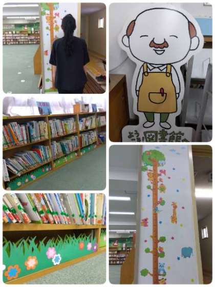 みんなが過ごしやすく、楽しい図書館となるように、学校司書が工夫をしています。本棚の下に草原をイメージした飾りつけや「ようこそ図書館へおじさん」の設置、柱の隙間スペースに可愛い身長計を設置するなどしています。わくわくする図書館を目指しています。
